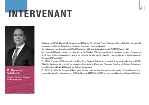 OUDRHIRI immobilier locatif, puis rejoint en 2020 le Groupe MAMDA-MCMA en tant que Directeur Général Délégué.